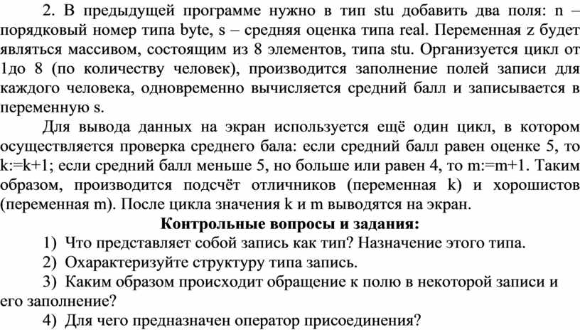 2. В предыдущей программе нужно в тип stu добавить два поля: n – порядковый номер типа byte, s – средняя оценка типа real. Переменная z будет являться массивом, состоящим из 8 элементов, типа stu. Организуется цикл от 1до 8 (по количеству человек), производится заполнение полей записи для каждого человека, одновременно вычисляется средний балл и записывается в переменную s.