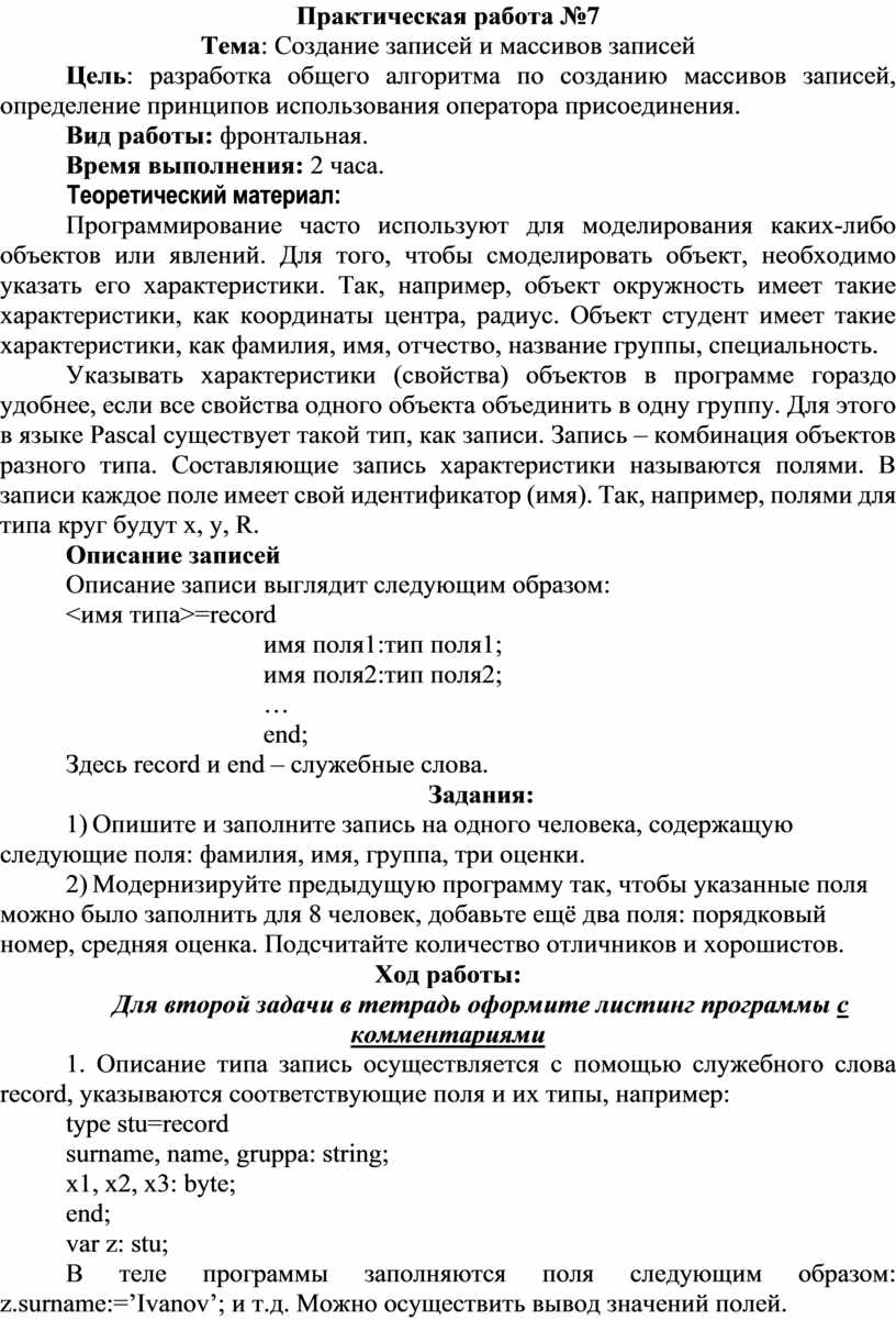 Цель: разработка общего алгоритма по созданию массивов записей, определение принципов использования оператора присоединения.