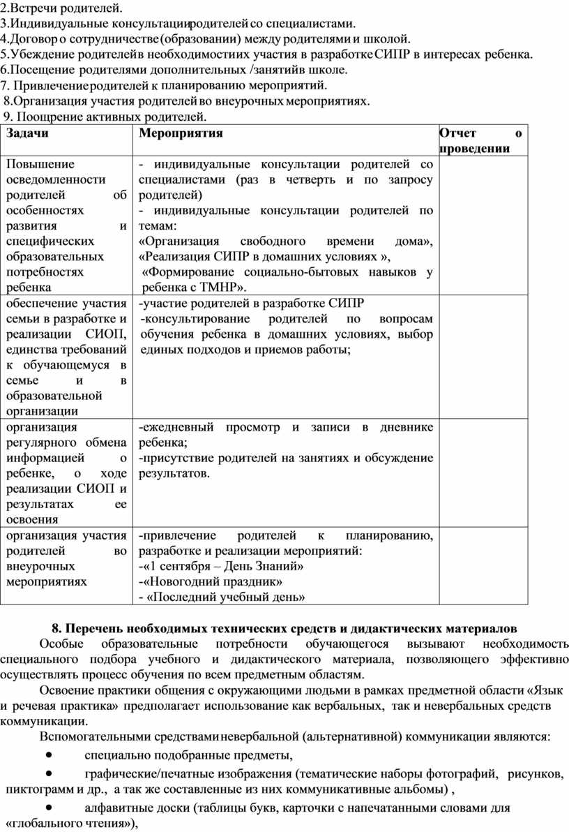 -участие родителей в разработке СИПР -консультирование родителей по вопросам обучения ребенка в домашних условиях, выбор единых подходов и приемов работы;