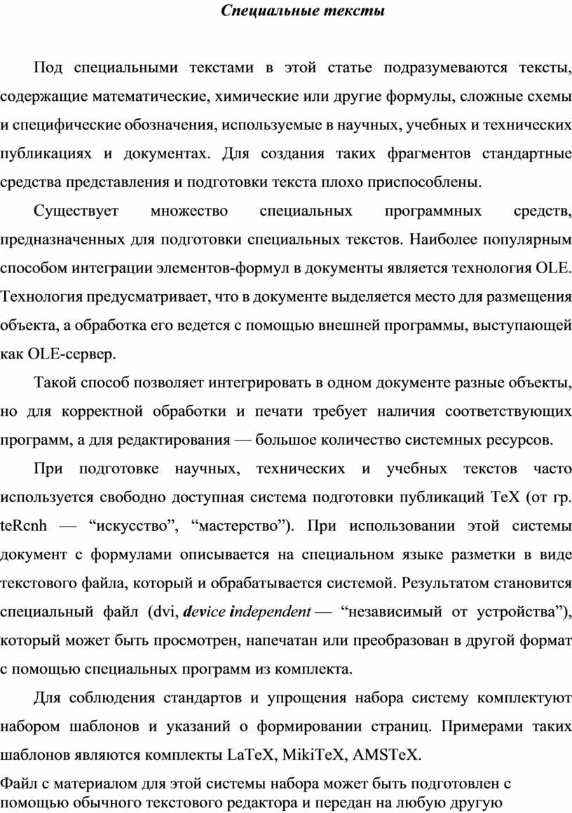 Под специальными текстами в этой статье подразумеваются тексты, содержащие математические, химические или другие формулы, сложные схемы и специфические обозначения, используемые в научных, учебных и технических публикациях и документах. Для создания таких фрагментов стандартные средства представления и подготовки текста плохо приспособлены.