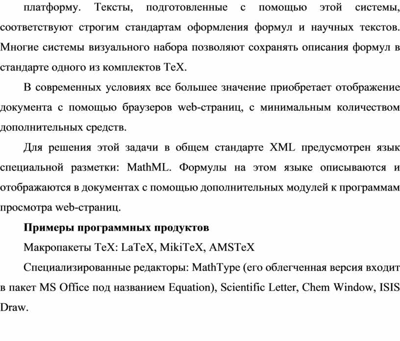 При подготовке научных, технических и учебных текстов часто используется свободно доступная система подготовки публикаций TeX (от гр. teRcnh — “искусство”, “мастерство”). При использовании этой системы документ с формулами описывается на специальном языке разметки в виде текстового файла, который и обрабатывается системой. Результатом становится специальный файл (dvi, device independent — “независимый от устройства”), который может быть просмотрен, напечатан или преобразован в другой формат с помощью специальных программ из комплекта.