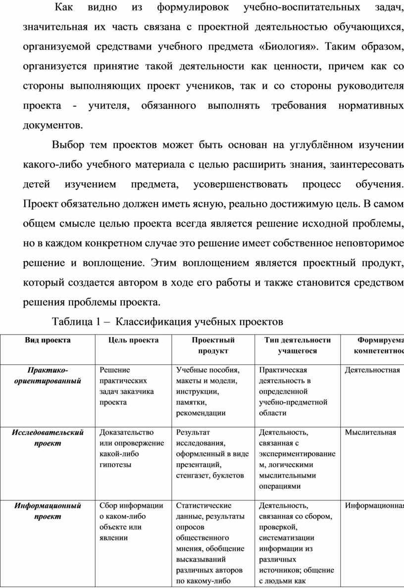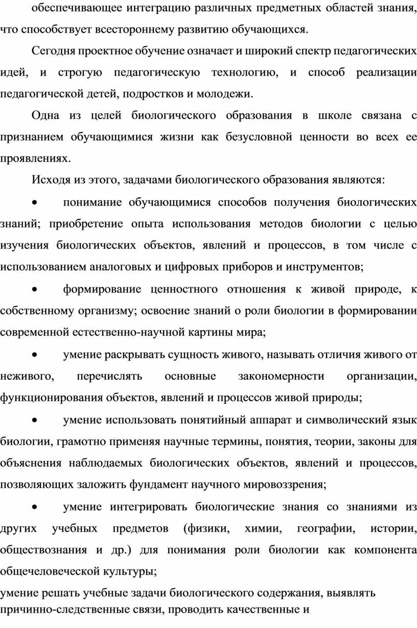 Как видно из формулировок учебно-воспитательных задач, значительная их часть связана с проектной деятельностью обучающихся, организуемой средствами учебного предмета «Биология». Таким образом, организуется принятие такой деятельности как ценности, причем как со стороны выполняющих проект учеников, так и со стороны руководителя проекта - учителя, обязанного выполнять требования нормативных документов.