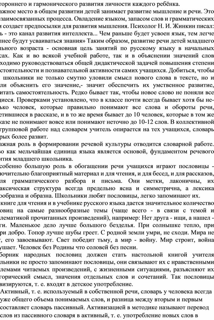 Важное место в общем развитии детей занимает развитие мышление и речи. Это два взаимосвязанных процесса. Овладение языком, запасом слов и грамматических форм создает предпосылки для развития мышления. Психолог Н. И. Жинкин писал: «Речь - это канал развития интеллекта... Чем раньше будет усвоен язык, тем легче и полнее будут усваиваться знания» Таким образом, развитие речи детей младшего школьного возраста - основная цель занятий по русскому языку в начальных классах. Как и во всякой учебной работе, так и в объяснении значений слов необходимо руководствоваться общей дидактической задачей повышения степени самостоятельности и познавательной активности самих учащихся. Добиться, чтобы сами школьники не только смутно уловили смысл нового слова в тексте, но и сумели объяснить его значение,- значит обеспечить их умственное развитие, воспитать самостоятельность. Редко бывает так, чтобы новое слово не поняли все учащиеся. Проверками установлено, что в классе почти всегда бывает хотя бы несколько человек, которые правильно понимают все слова и обороты речи, встретившиеся в рассказе, и в то же время бывает до 10 человек, которые в том же рассказе не понимают вовсе или понимают неточно до 10-12 слов. В коллективной или групповой работе над словарем учитель опирается на тех учащихся, словарь которых более развит.