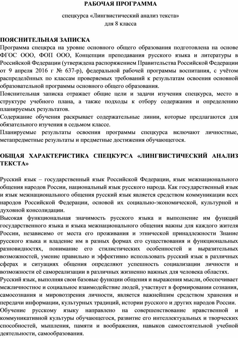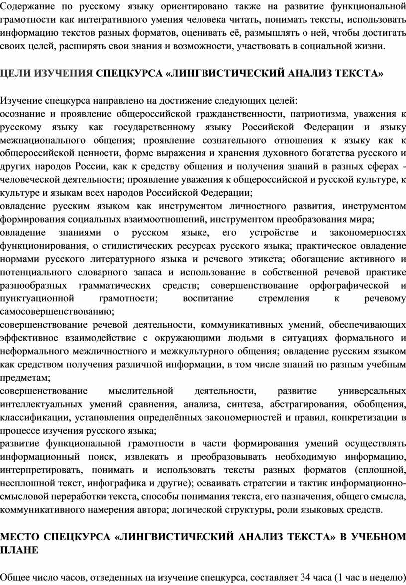 ОБЩАЯ ХАРАКТЕРИСТИКА СПЕЦКУРСА «ЛИНГВИСТИЧЕСКИЙ АНАЛИЗ ТЕКСТА»