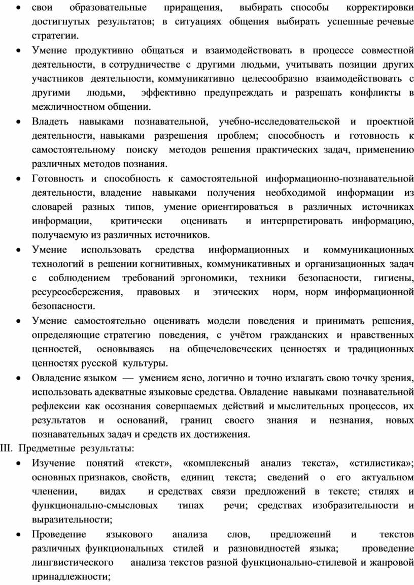 · Изучение понятий «текст», «комплексный анализ текста», «стилистика»; основных признаков, свойств, единиц текста; сведений о его актуальном членении, видах и средствах связи предложений в тексте; стилях и функционально-смысловых типах речи; средствах изобразительности и выразительности;