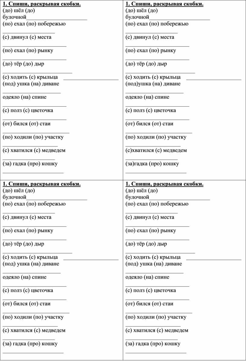 1. Спиши, раскрывая скобки. (до) шёл (до) булочной_____________________ (по) ехал (по) побережью __________________ (с) двинул (с) места ______________________ (по) ехал (по) рынку ______________________ (до) тёр (до) дыр ________________________ (с) ходить (с) крыльца ___________________ (под) ушка (на) диване ____________________ одеяло (на) спине ______________________ (с) полз (с) цветочка ______________________ (от) бился (от) стаи _______________________ (по) ходили (по) участку ___________________ (с) хватился (с) медведем __________________ (за) гадка (про) кошку _____________________