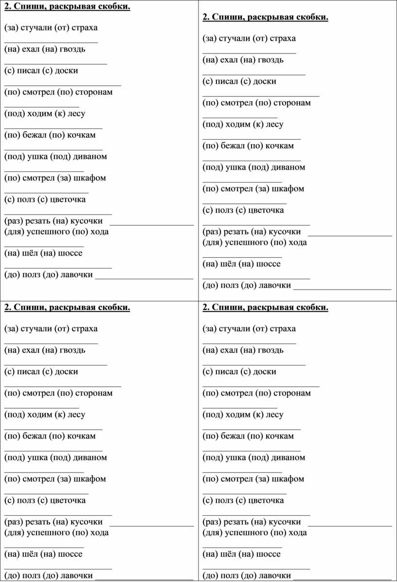 (за) стучали (от) страха ____________________ (на) ехал (на) гвоздь ______________________ (с) писал (с) доски _________________________ (по) смотрел (по) сторонам ________________ (под) ходим (к) лесу _____________________ (по) бежал (по) кочкам _____________________ (под) ушка (под) диваном _________________ (по) смотрел (за) шкафом __________________ (с) полз (с) цветочка _______________________ (раз) резать (на) кусочки __________________ (для) успешного (по) хода _________________ (на) шёл (на) шоссе _______________________ (до) полз (до) лавочки _____________________ |