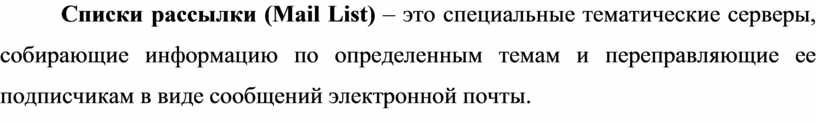 Списки рассылки (Mail List) – это специальные тематические серверы, собирающие информацию по определенным темам и переправляющие ее подписчикам в виде сообщений электронной почты.