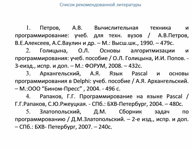 1. Петров, А.В. Вычислительная техника и программирование: учеб. для техн. вузов / А.В.Петров, В.Е.Алексеев, А.С.Ваулин и др. – М.: Высш.шк., 1990. – 479с.