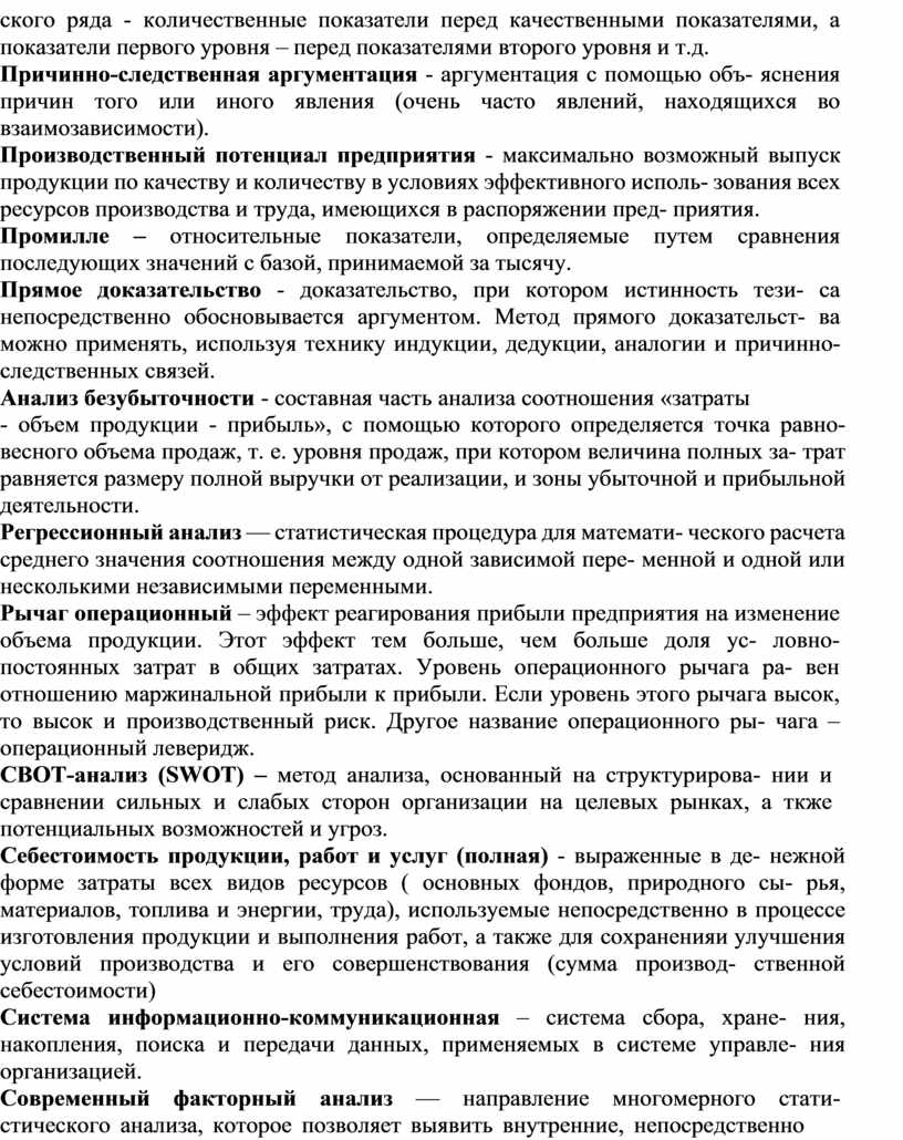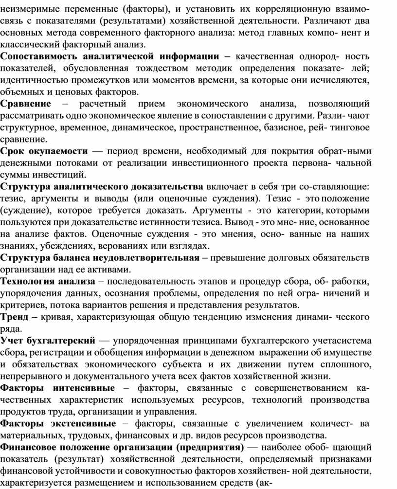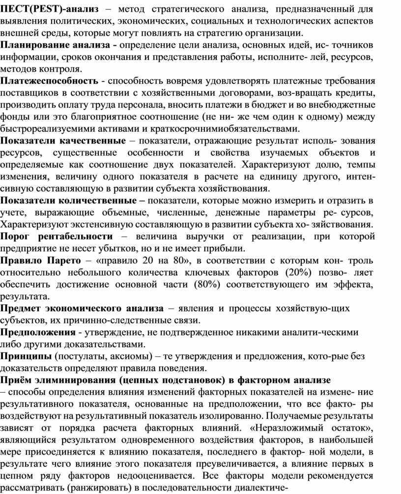 Анализ экономический в узком смысле слова — анализ производственно- хозяйственной и финансово-хозяйственной деятельности субъектов хозяйство- вания с целью оценки динамики развития количественных и качественных по- казателей, уровня выполнения плановых заданий, силы влияния факторов на изменение показателей, резервов роста, финансового состояния и конкурентно- го положения на рынке.