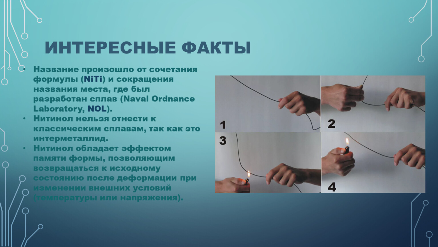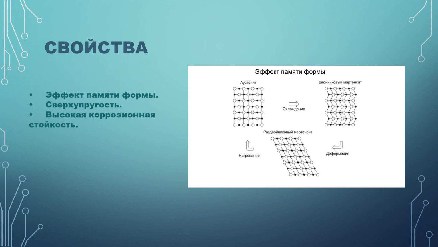 Нитинол обладает эффектом памяти формы, позволяющим возвращаться к исходному состоянию после деформации при изменении внешних условий (температуры или напряжения).