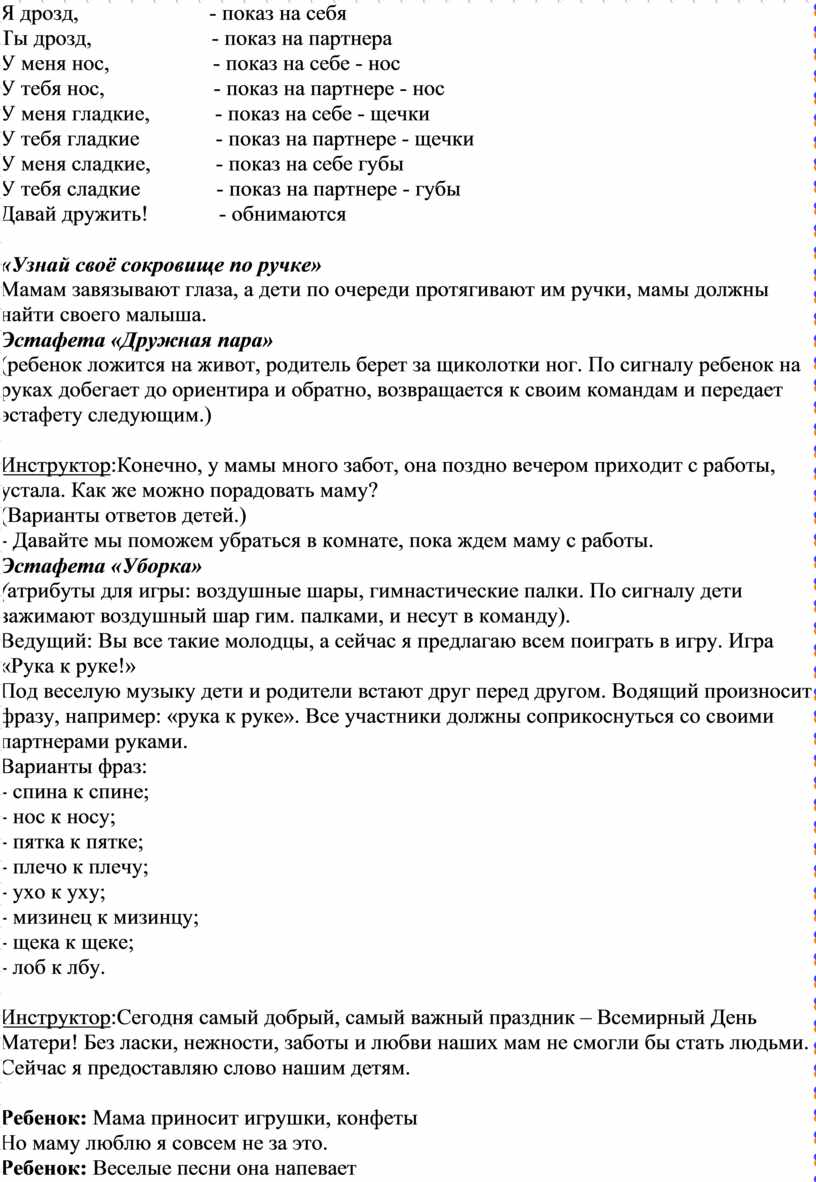 Инструктор:Сегодня самый добрый, самый важный праздник – Всемирный День Матери! Без ласки, нежности, заботы и любви наших мам не смогли бы стать людьми. Сейчас я предоставляю слово нашим детям.