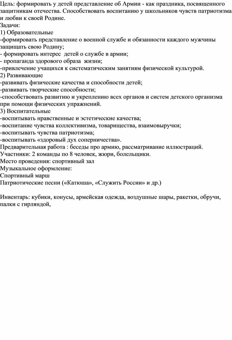 Цель: формировать у детей представление об Армии - как праздника, посвященного защитникам отечества. Способствовать воспитанию у школьников чувств патриотизма и любви к своей Родине.