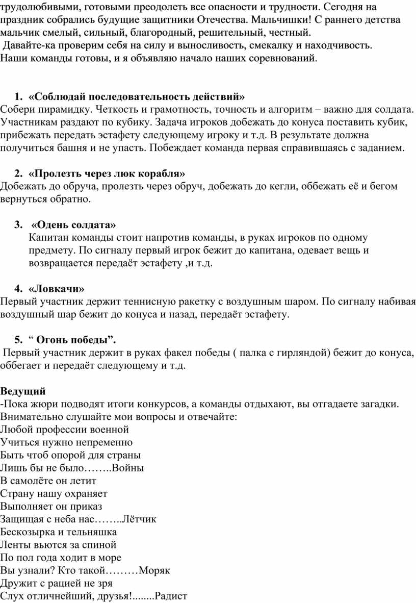 Все мы ценим бойцов Российской армии. Они стоят на страже мира. Героев армии знает вся страна и многие из вас хотят быть похожими на них – сильными, смелыми, трудолюбивыми, готовыми преодолеть все опасности и трудности. Сегодня на праздник собрались будущие защитники Отечества. Мальчишки! С раннего детства мальчик смелый, сильный, благородный, решительный, честный.