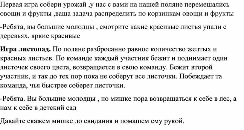 Игра листопад. По поляне разбросанно равное количество желтых и красных листьев. По команде каждый участник бежит и поднимает один листочек своего цвета, возвращается в свою команду. Бежит второй участник, и так до тех пор пока не соберут все листочки. Побеждает та команда, чья быстрее соберет листочки.