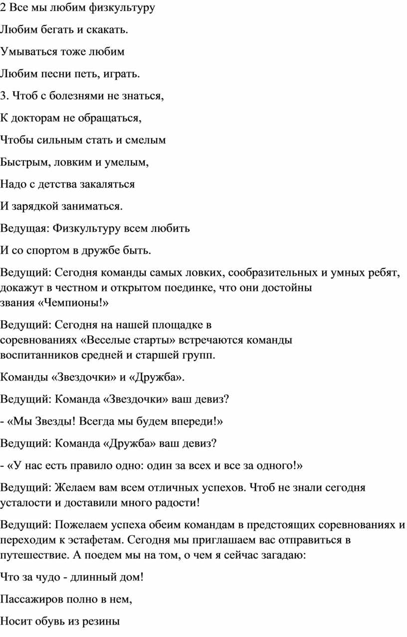 Ведущий: Сегодня на нашей площадке в соревнованиях «Веселые старты» встречаются команды воспитанников средней и старшей групп.