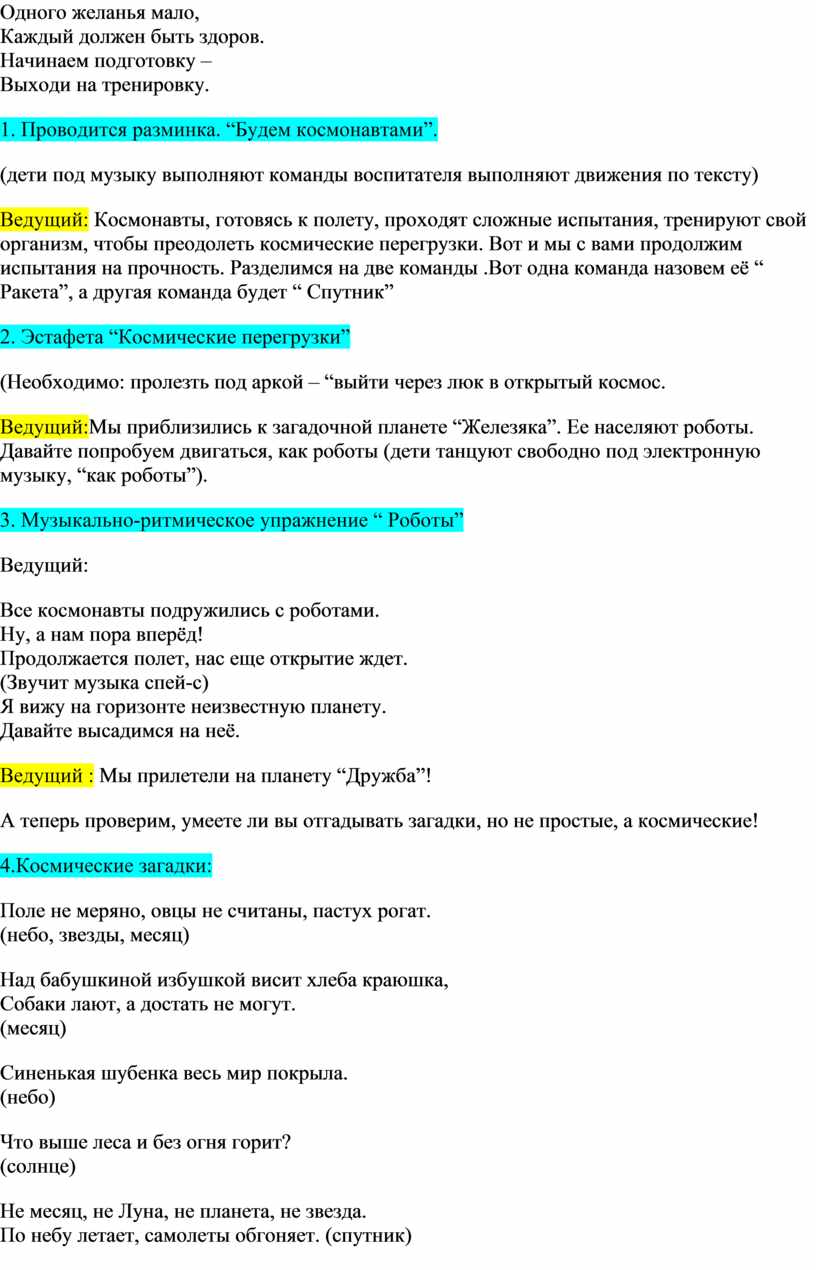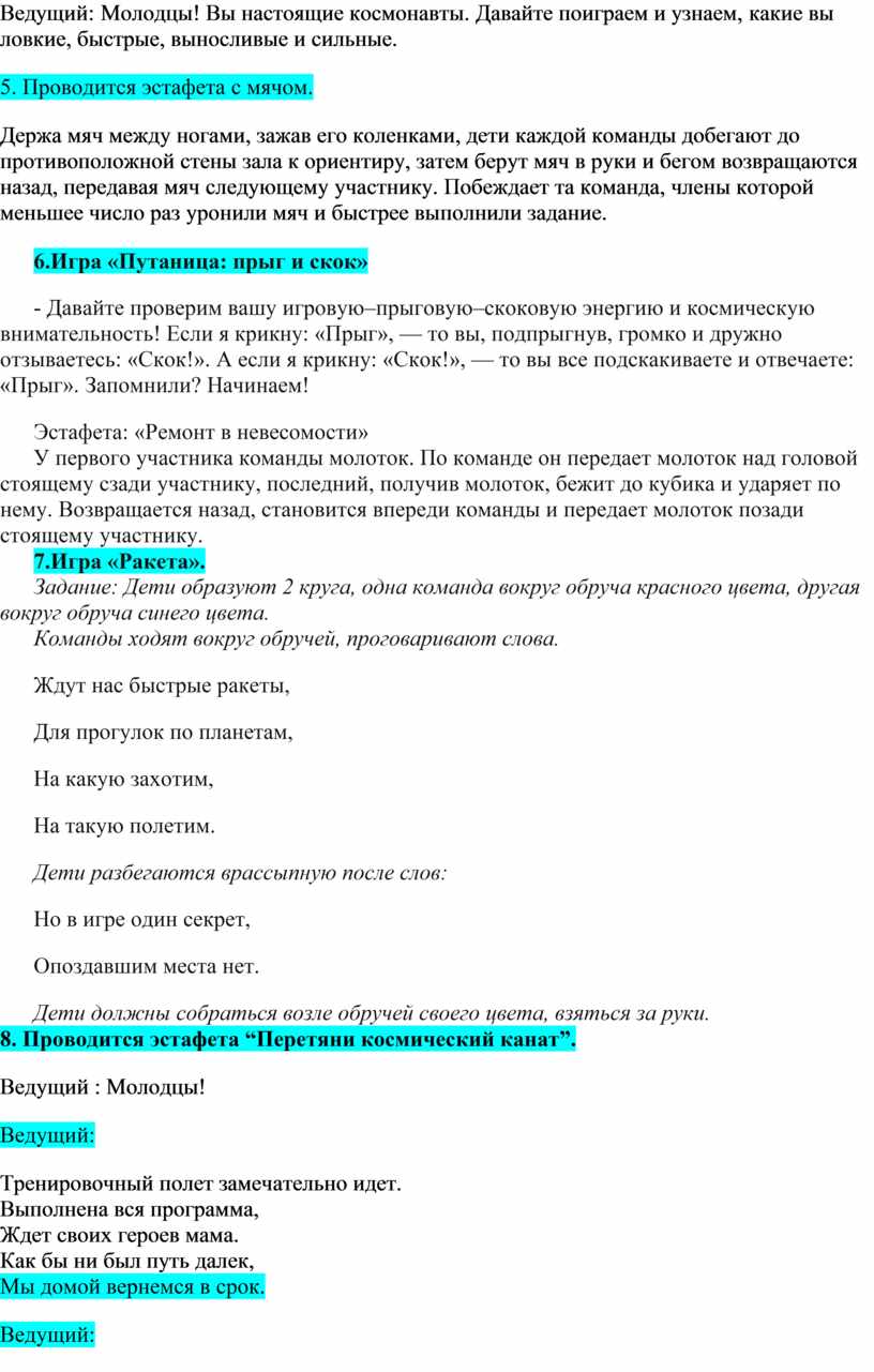 Ведущий: Молодцы! Вы настоящие космонавты. Давайте поиграем и узнаем, какие вы ловкие, быстрые, выносливые и сильные.