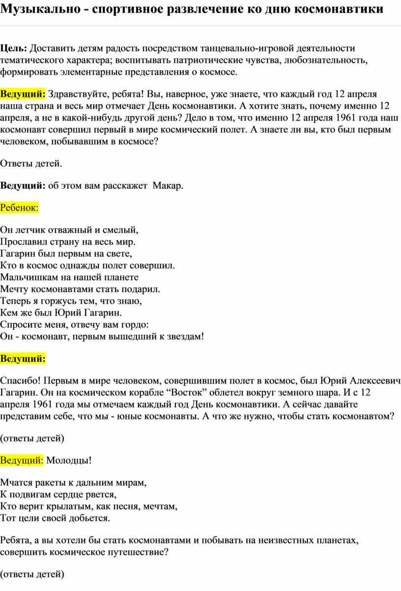 Ведущий: Здравствуйте, ребята! Вы, наверное, уже знаете, что каждый год 12 апреля наша страна и весь мир отмечает День космонавтики. А хотите знать, почему именно 12 апреля, а не в какой-нибудь другой день? Дело в том, что именно 12 апреля 1961 года наш космонавт совершил первый в мире космический полет. А знаете ли вы, кто был первым человеком, побывавшим в космосе?