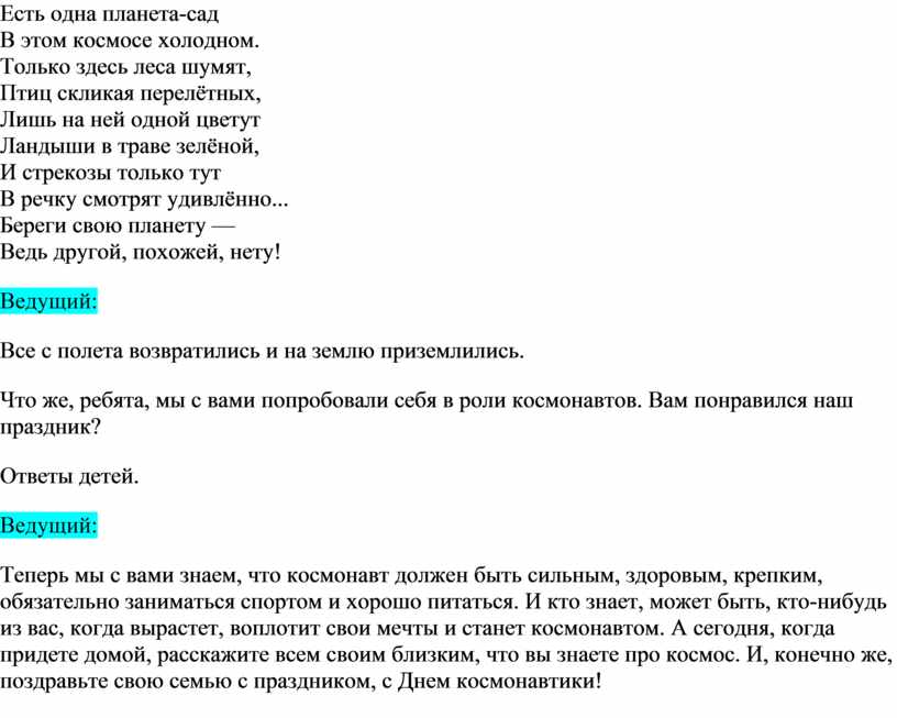 Теперь мы с вами знаем, что космонавт должен быть сильным, здоровым, крепким, обязательно заниматься спортом и хорошо питаться. И кто знает, может быть, кто-нибудь из вас, когда вырастет, воплотит свои мечты и станет космонавтом. А сегодня, когда придете домой, расскажите всем своим близким, что вы знаете про космос. И, конечно же, поздравьте свою семью с праздником, с Днем космонавтики!