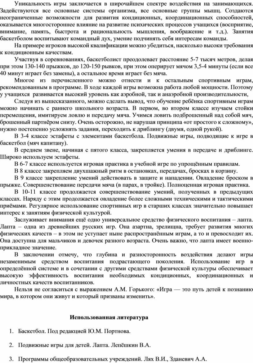 Раздел «Подвижные игры» в начальной школе и «Спортивные игры» в основной и средней школе содержит учебный материал, являющийся незаменимым средством, решения комплекса взаимосвязанных задач воспитания личности школьника, развития его разнообразных двигательных способностей, совершенствования умений и навыков, необходимых в спортивной деятельности и в жизни.