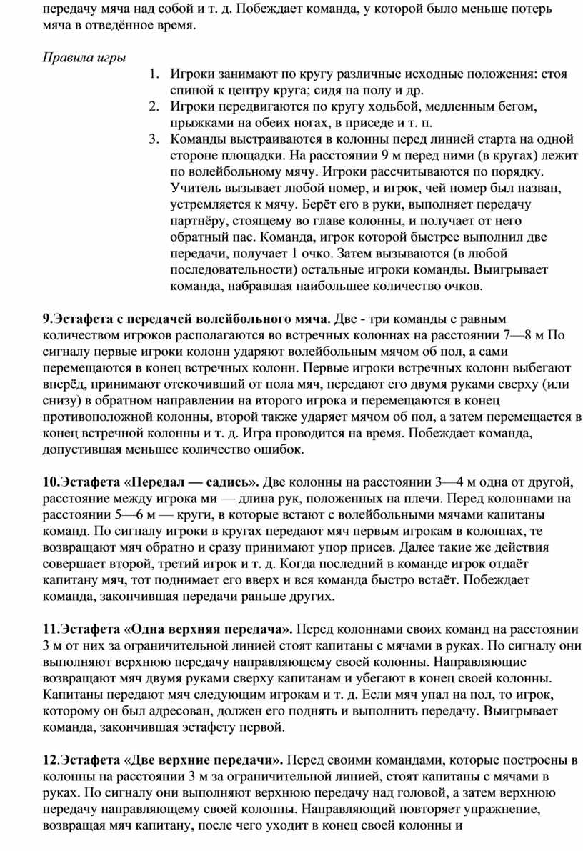 т.д. Выигрывает команда, первой закончившая эстафету. Упавший на пол мяч поднимает игрок, которому он был адресован.
