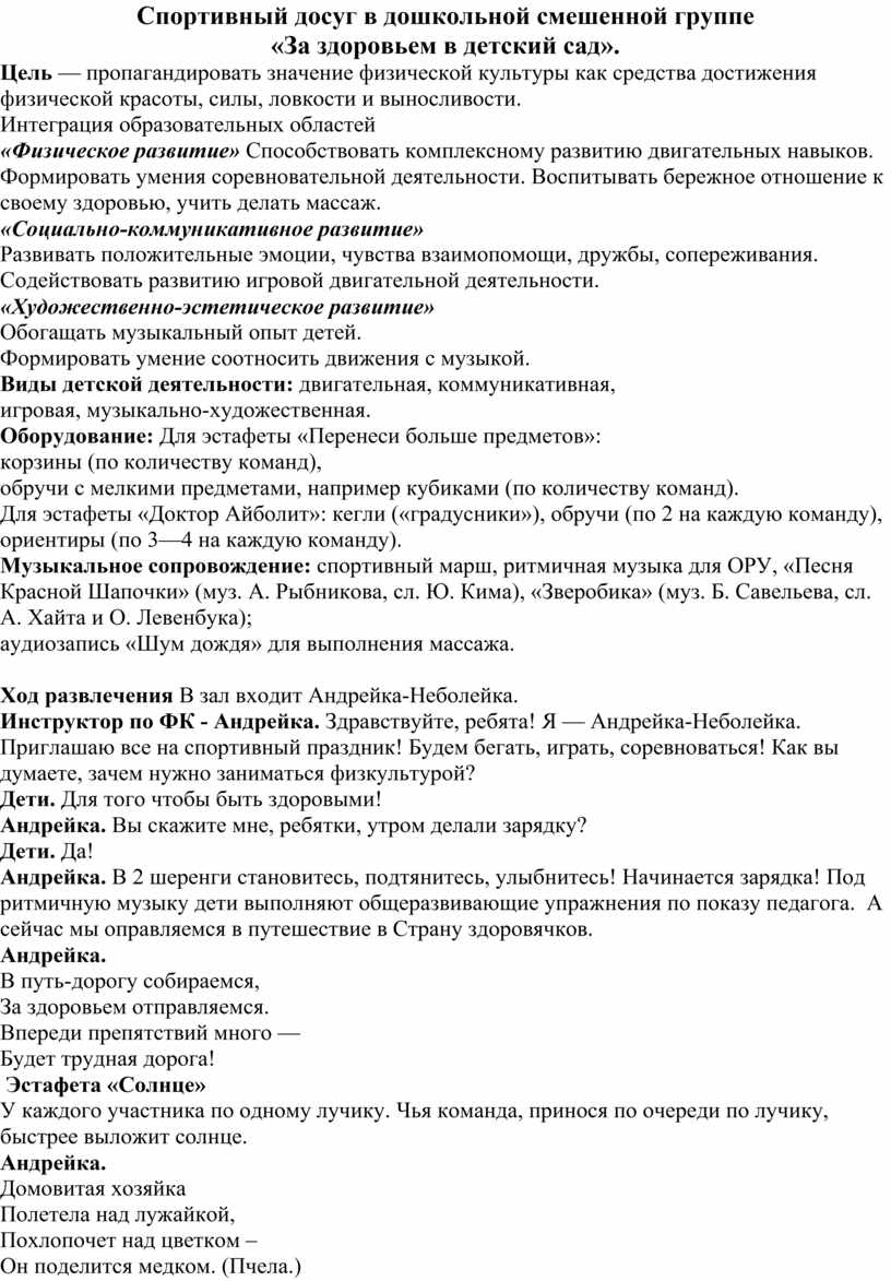 Андрейка. В 2 шеренги становитесь, подтянитесь, улыбнитесь! Начинается зарядка! Под ритмичную музыку дети выполняют общеразвивающие упражнения по показу педагога. А сейчас мы оправляемся в путешествие в Страну здоровячков.