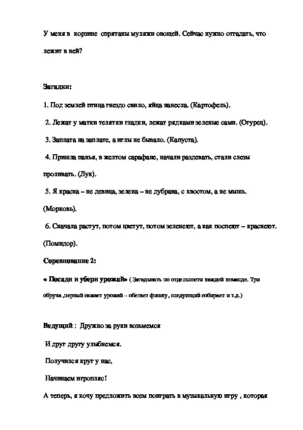 Ведущий:У меня в корзине спрятаны муляжи овощей. Сейчас нужно отгадать, что