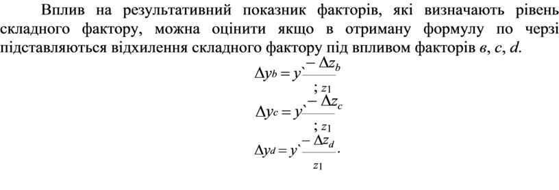 Вплив на результативний показник факторів, які визначають рівень складного фактору, можна оцінити якщо в отриману формулу по черзі підставляються відхилення складного фактору під впливом факторів в, с, d.