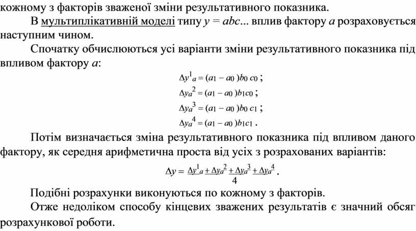 В мультиплікативній моделі типу y = abс... вплив фактору а розраховується наступним чином.