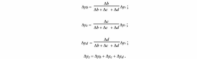 Зміна результативного показника під впливом факторів в, с, d визначається шляхом розрахунку частки приросту кожного з цих факторів у загальній сумі їх приросту та її помноження на зміну результативного показника під впливом складного фактору.