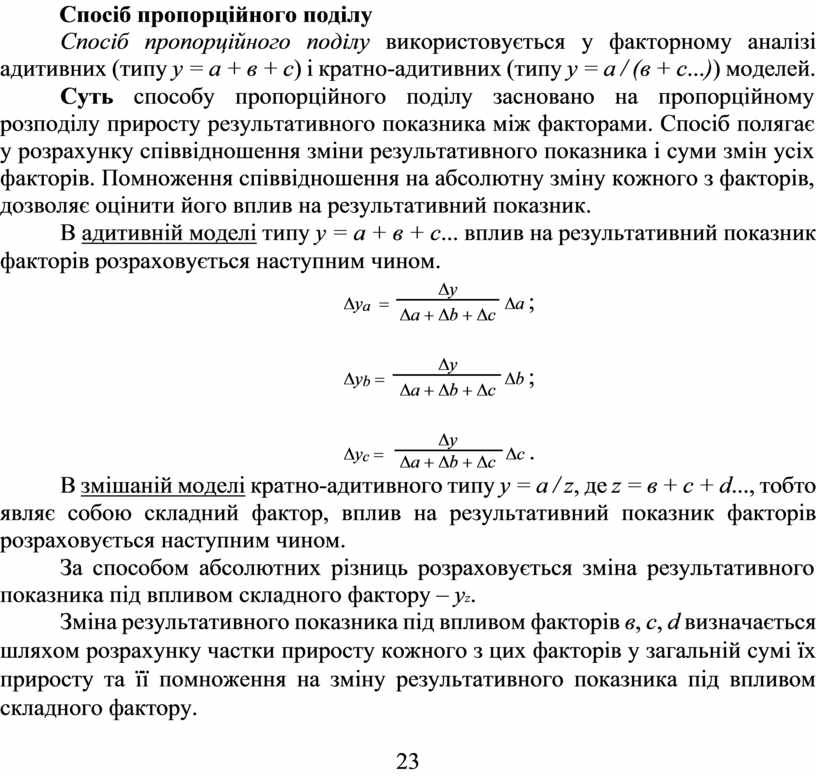 Суть способу пропорційного поділу засновано на пропорційному розподілу приросту результативного показника між факторами. Спосіб полягає у розрахунку співвідношення зміни результативного показника і суми змін усіх факторів. Помноження співвідношення на абсолютну зміну кожного з факторів, дозволяє оцінити його вплив на результативний показник.