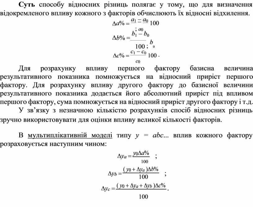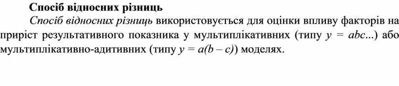 Спосіб відносних різниць використовується для оцінки впливу факторів на приріст результативного показника у мультиплікативних (типу y = abс...) або мультиплікативно-адитивних (типу y = a(b – с)) моделях.