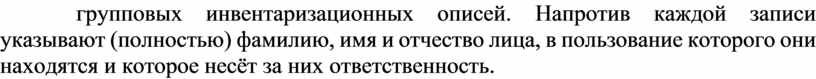 Это МБП, выданные в индивидуальное использование, например, спецодежда и спецобувь, допускается составление групповых инвентаризационных описей (на куртки, сапоги и халаты) с определением лиц, которые выданы такие предметы. Обязательным условием при этом является ведение личных карточек на такие предметы и наличие в инвентаризационных описях подписей лиц, которые получили эти предметы.