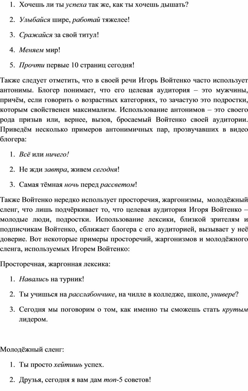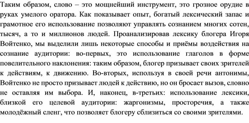 Таким образом, слово – это мощнейший инструмент, это грозное орудие в руках умелого оратора. Как показывает опыт, богатый лексический запас и грамотное его использование позволяют управлять сознанием многих сотен, тысяч, а то и миллионов людей. Проанализировав лексику блогера Игоря Войтенко, мы выделили лишь некоторые способы и приёмы воздействия на сознание аудитории: во-первых, это использование глаголов в форме повелительного наклонения: таким образом, блогер призывает своих зрителей к действиям, к движению. Во-вторых, используя в своей речи антонимы, Войтенко не просто призывает людей к действию, но он бросает вызов, словно не оставляя им выбора. И, наконец, в-третьих: использование лексики, близкой его целевой аудитории: жаргонизмы, просторечия, а также молодёжный сленг, что позволяет блогеру сблизиться со своими зрителями.
