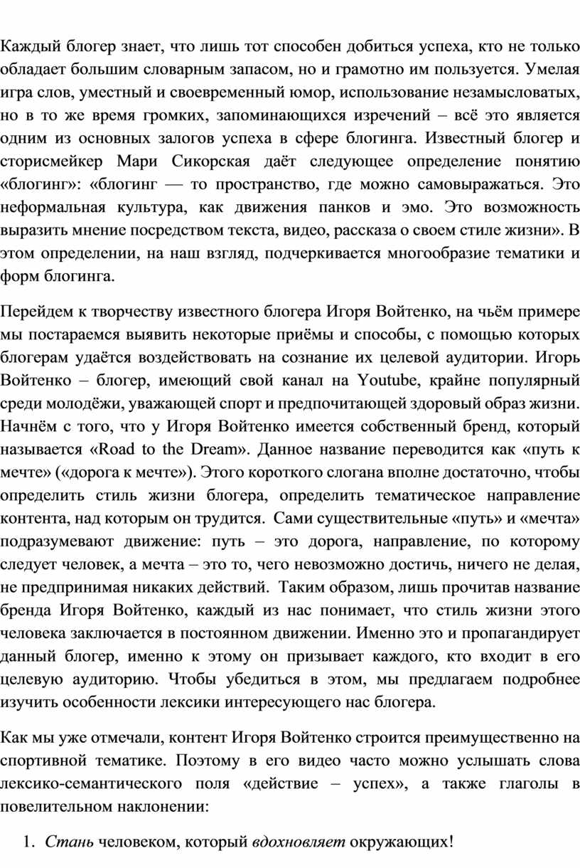 Перейдем к творчеству известного блогера Игоря Войтенко, на чьём примере мы постараемся выявить некоторые приёмы и способы, с помощью которых блогерам удаётся воздействовать на сознание их целевой аудитории. Игорь Войтенко – блогер, имеющий свой канал на Youtube, крайне популярный среди молодёжи, уважающей спорт и предпочитающей здоровый образ жизни. Начнём с того, что у Игоря Войтенко имеется собственный бренд, который называется «Road to the Dream». Данное название переводится как «путь к мечте» («дорога к мечте»). Этого короткого слогана вполне достаточно, чтобы определить стиль жизни блогера, определить тематическое направление контента, над которым он трудится. Сами существительные «путь» и «мечта» подразумевают движение: путь – это дорога, направление, по которому следует человек, а мечта – это то, чего невозможно достичь, ничего не делая, не предпринимая никаких действий. Таким образом, лишь прочитав название бренда Игоря Войтенко, каждый из нас понимает, что стиль жизни этого человека заключается в постоянном движении. Именно это и пропагандирует данный блогер, именно к этому он призывает каждого, кто входит в его целевую аудиторию. Чтобы убедиться в этом, мы предлагаем подробнее изучить особенности лексики интересующего нас блогера.