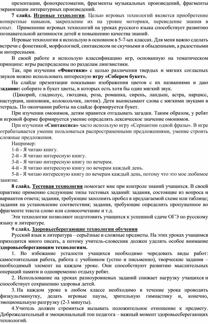 В своей практике, чтобы сохранить интерес к предмету и сделать учебно-воспитательный процесс качественным, на уроках русского языка и литературы использую презентации, фонохрестоматии, фрагменты музыкальных произведений, фрагменты экранизации литературных произведений.