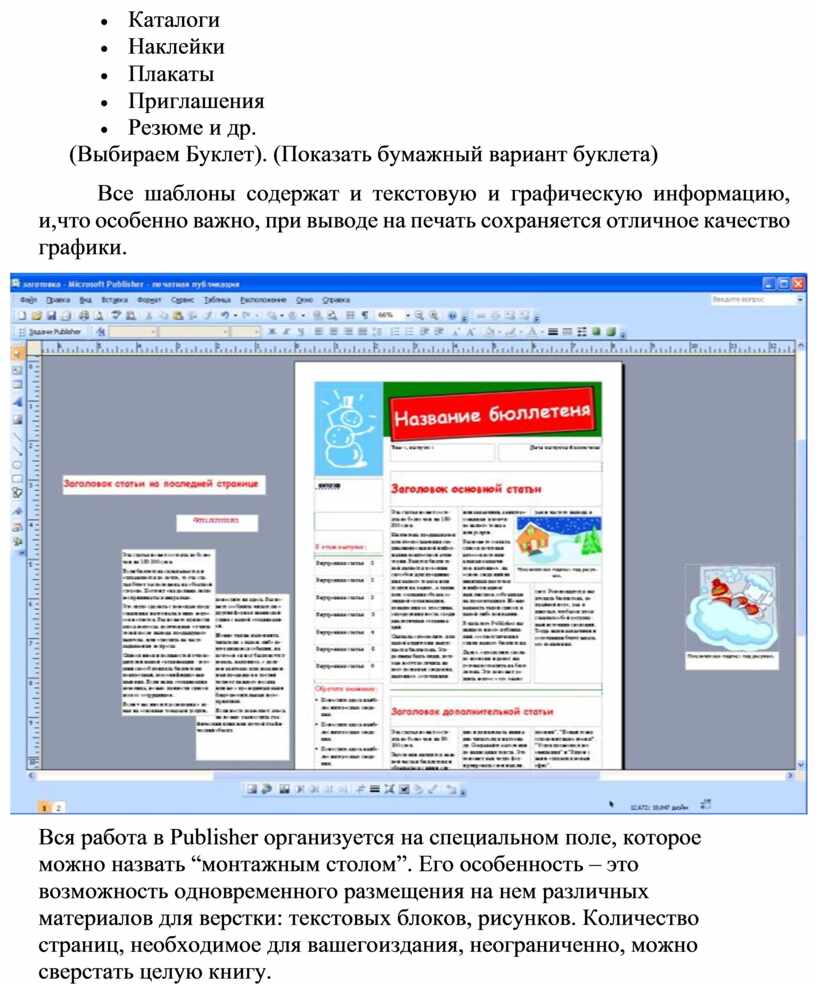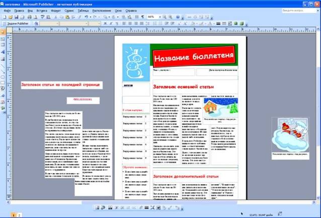 Вся работа в Publisher организуется на специальном поле, которое можно назвать “монтажным столом”. Его особенность – это возможность одновременного размещения на нем различных материалов для верстки: текстовых блоков, рисунков. Количество страниц, необходимое для вашего издания, неограниченно, можно сверстать целую книгу.