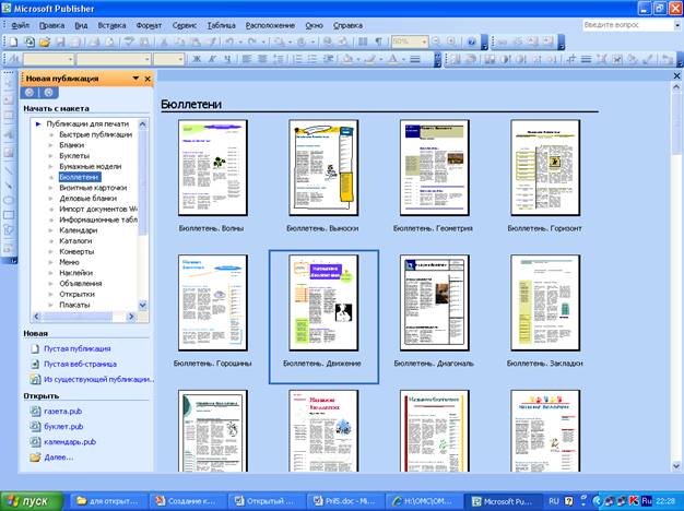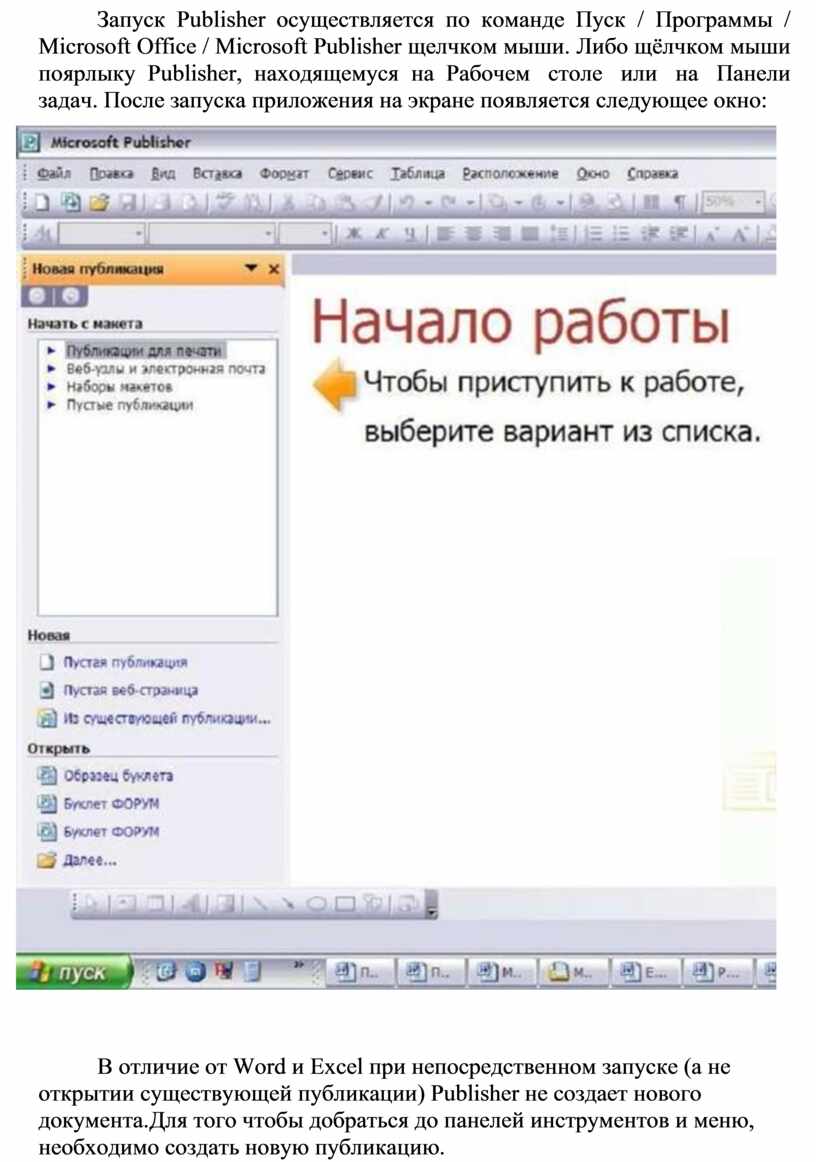В отличие от Word и Excel при непосредственном запуске (а не открытии существующей публикации) Publisher не создает нового документа. Для того чтобы добраться до панелей инструментов и меню, необходимо создать новую публикацию.