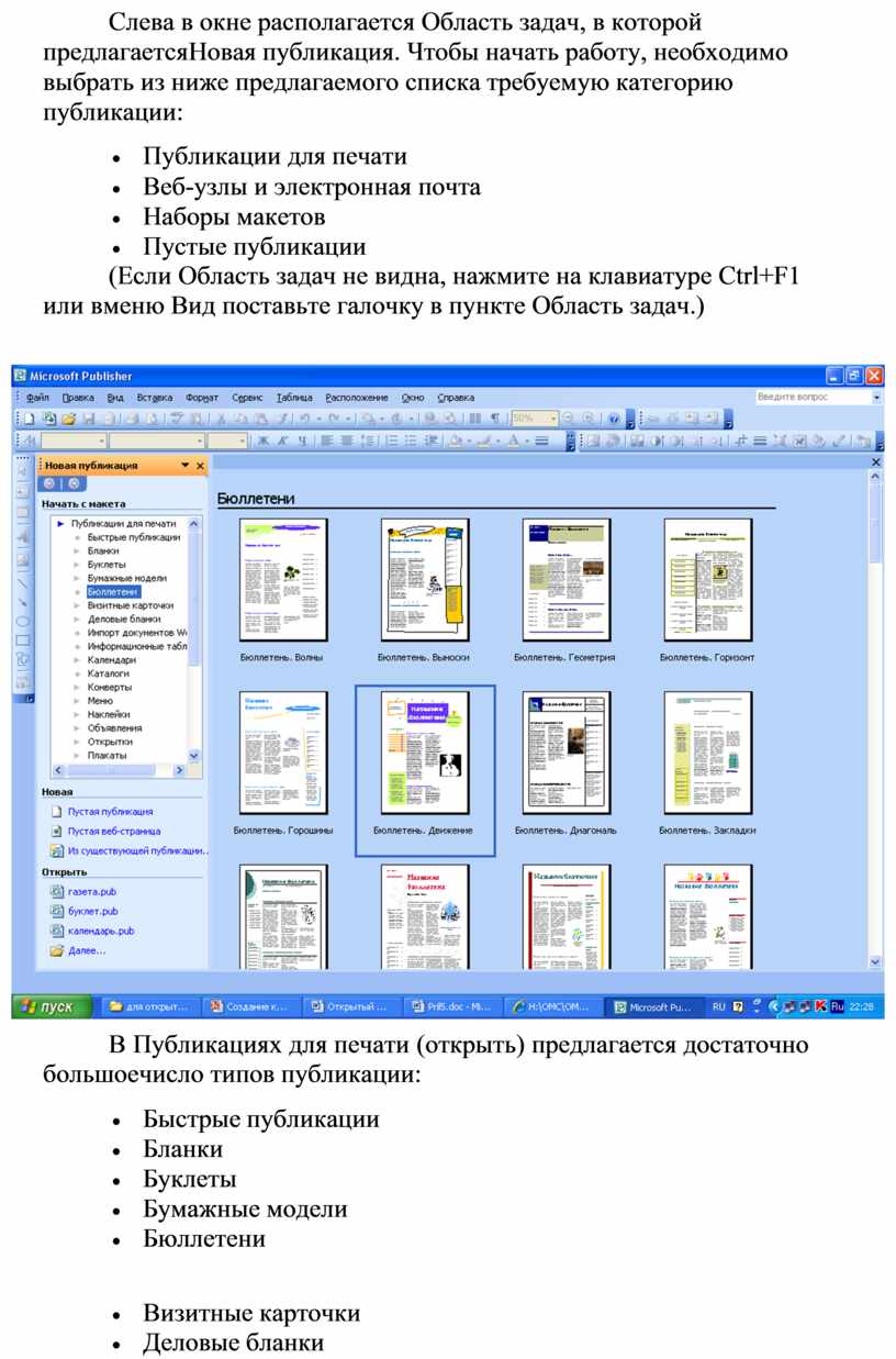 Слева в окне располагается Область задач, в которой предлагается Новая публикация. Чтобы начать работу, необходимо выбрать из ниже предлагаемого списка требуемую категорию публикации: