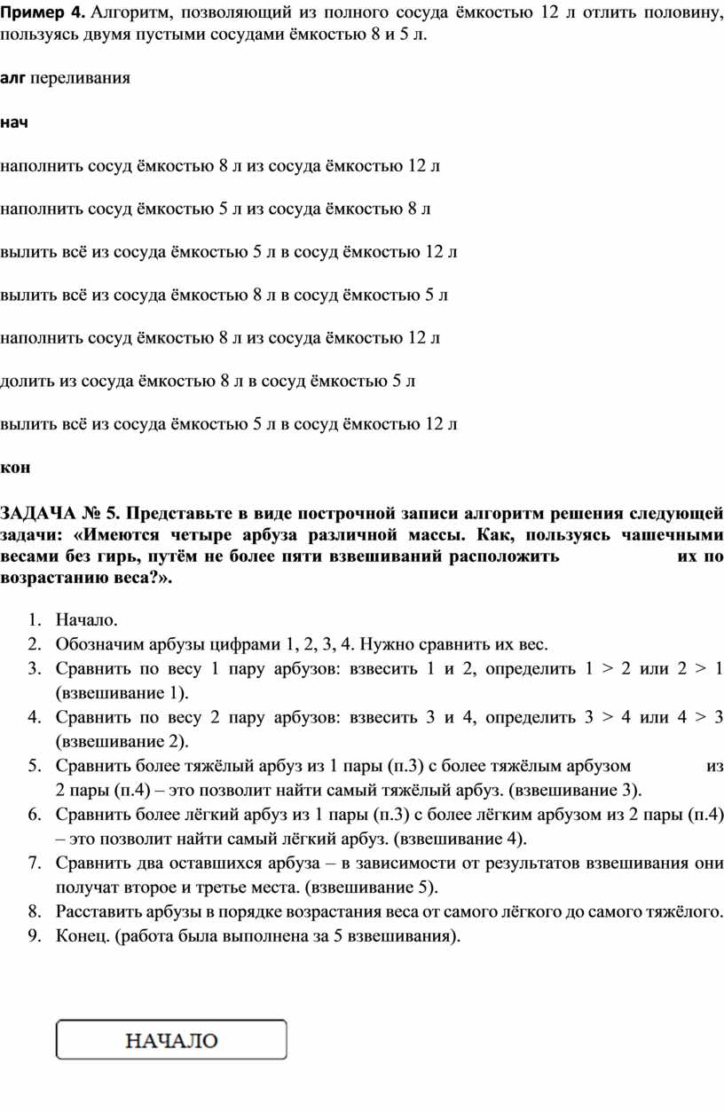ЗАДАЧА № 5. Представьте в виде построчной записи алгоритм решения следующей задачи: «Имеются четыре арбуза различной массы. Как, пользуясь чашечными весами без гирь, путём не более пяти взвешиваний расположить их по возрастанию веса?».