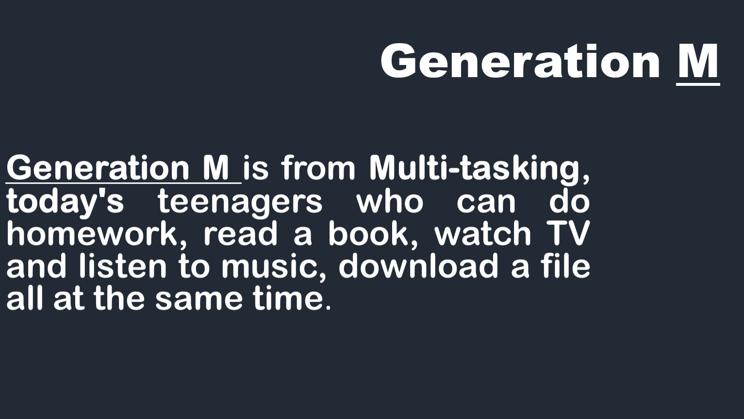 Generation M is from Multi-tasking, today's teenagers who can do homework, read a book, watch TV and listen to music, download a file all at the same time.