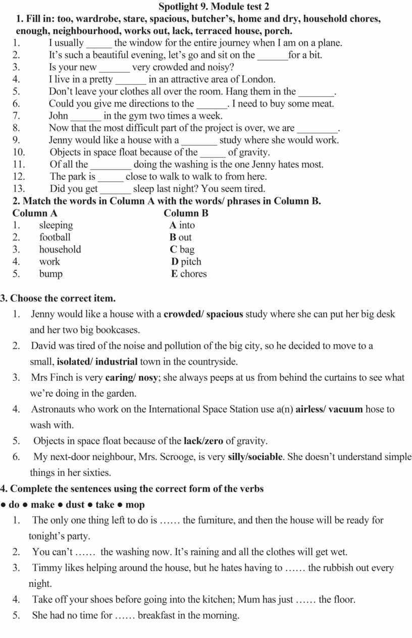 1. Fill in: too, wardrobe, stare, spacious, butcher’s, home and dry, household chores, enough, neighbourhood, works out, lack, terraced house, porch.