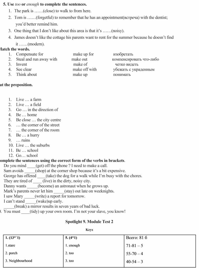 5. (4*1) 1. enough 2. too 3. too 4. enough 6.(5*2) 1. make up for 2.make off with 3. make up 4. make out 5. make of 7. (12*1) 1. on 2. in 3. in 4. at 5. to 6. on 7. in 8. in 9. in 10. in 11. at 12. to 8. (10*2) 1. getting 2. shopping 3. to take 4. living 5. to become 6. stay 7. writing 8. waking 9. breaking 10. tidy