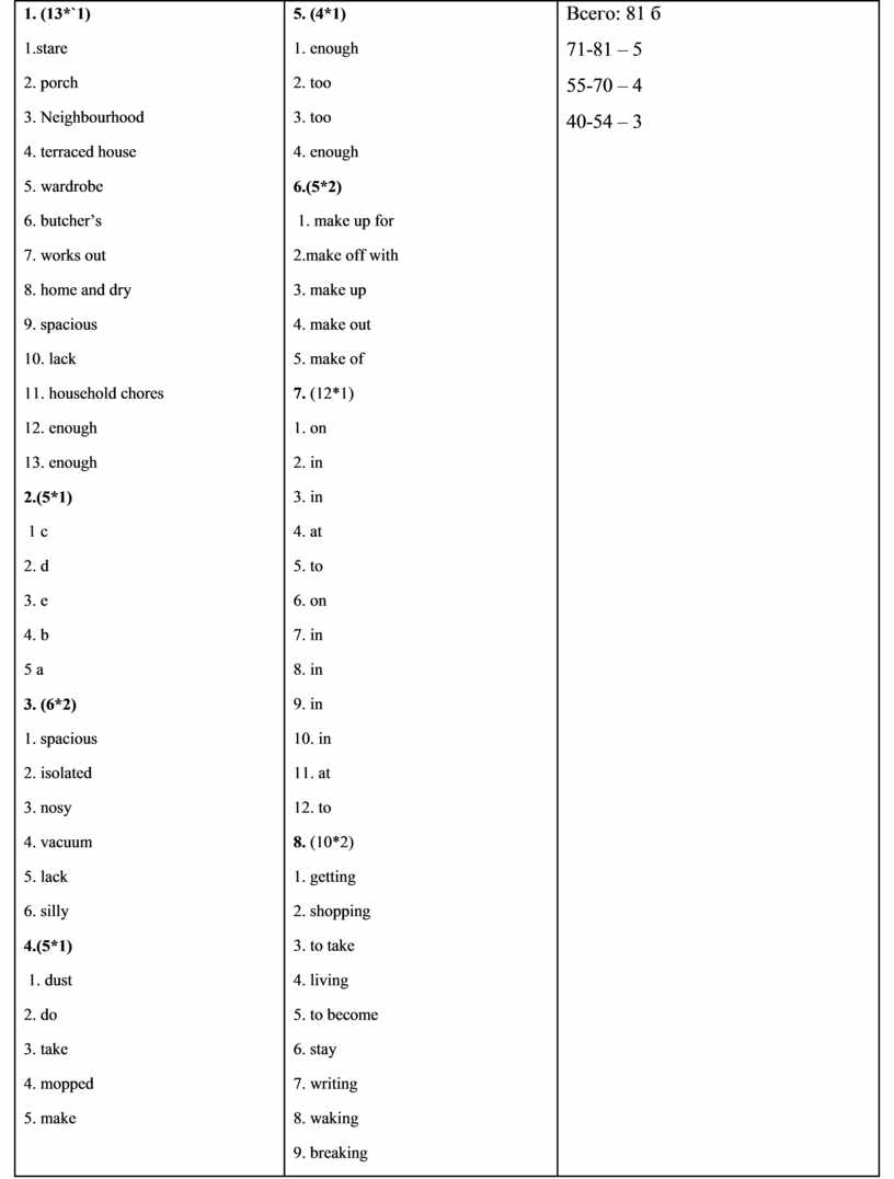 1. (13*`1) 1.stare 2. porch 3. Neighbourhood 4. terraced house 5. wardrobe 6. butcher’s 7. works out 8. home and dry 9. spacious 10. lack 11. household chores 12. enough 13. enough 2.(5*1) 1 c 2. d 3. e 4. b 5 a 3. (6*2) 1. spacious 2. isolated 3. nosy 4. vacuum 5. lack 6. silly 4.(5*1) 1. dust 2. do 3. take 4. mopped 5. make