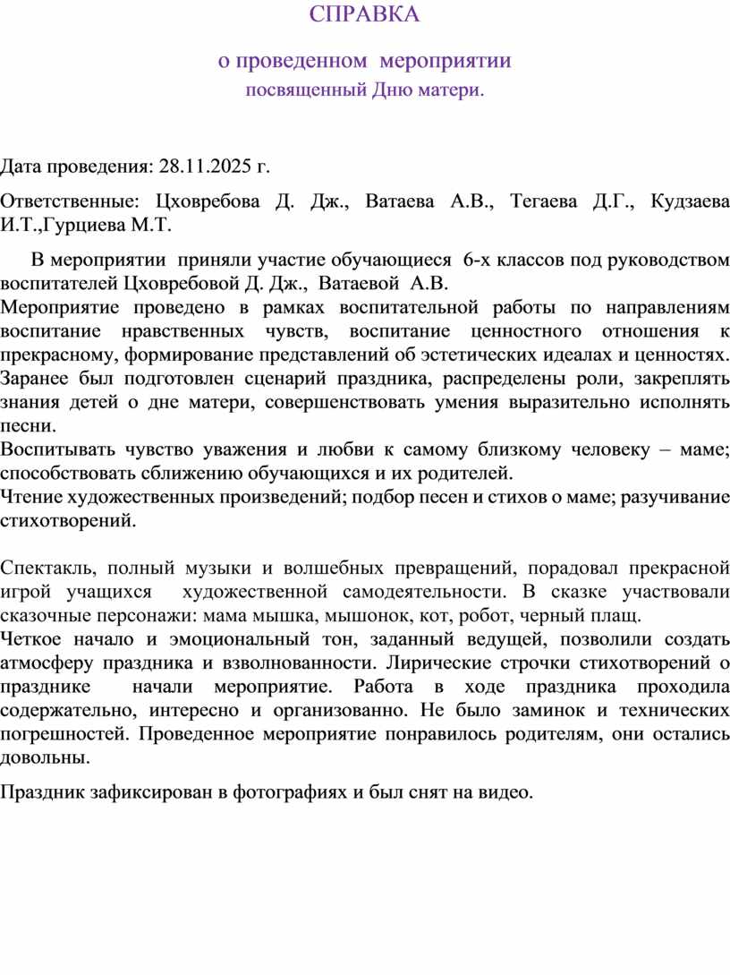 Мероприятие проведено в рамках воспитательной работы по направлениям воспитание нравственных чувств, воспитание ценностного отношения к прекрасному, формирование представлений об эстетических идеалах и ценностях. Заранее был подготовлен сценарий праздника, распределены роли, закреплять знания детей о дне матери, совершенствовать умения выразительно исполнять песни.