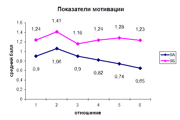 - У учащихся 9-х классов низкий уровень мотивации на получение знаний, причем уровень мотивации 9А класса значительно ниже уровня мотивации 9 Б класса. Можно отметить, что уровень мотивации у данных классов значительно снизился по сравнению с их же показателями в период обучения в 6-х классах.