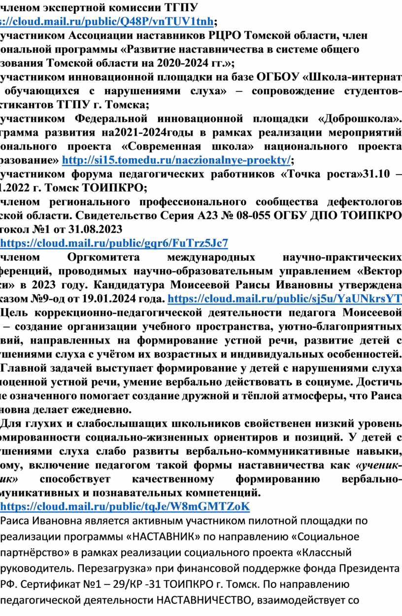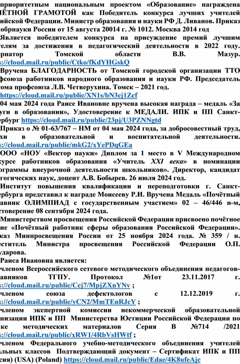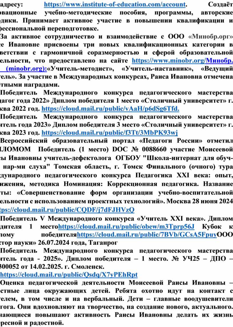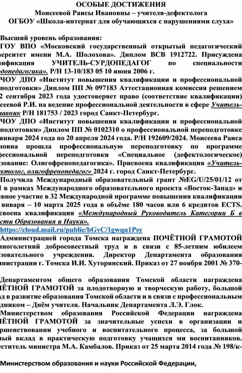 Всероссийский образовательный портал «Педагоги России» отметил ДИПЛОМОМ Победитель (1 место) DOC № 0088660 участие Моисеевой Раисы Ивановны учитель-дефектолога ОГБОУ "Школа-интернат для обуч-ся с нар-ми слуха" Томская область, г. Томск Финального (очного) тура Международного педагогического конкурса Педагогика XXI века: опыт, достижения, методика Номинация: Коррекционная педагогика. Название работы: «Совершенствование форм организации учебно-воспитательной деятельности с использованием проектных технологий». Москва 28 июня 2024 г. https://cloud.mail.ru/public/CQDF/j7dFJHVzQ