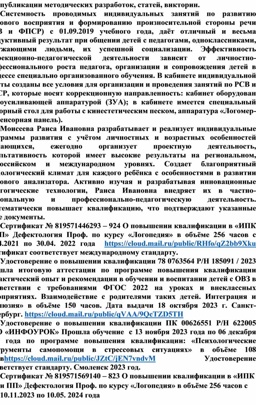 Сертификат № 819571569140 – 823 О повышении квалификации в «ИПК и ПП» Дефектология Проф. по курсу «Логопедия» в объёме 256 часов с 10.11.2023 по 10.05. 2024 года https://cloud.mail.ru/public/aYXZ/FmXYSwakEМосква Сертификат соответствует международному стандарту.