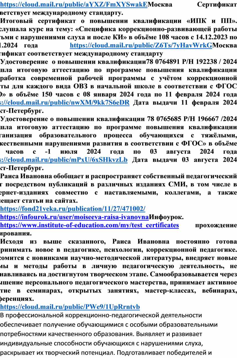Итоговый сертификат о повышении квалификации «ИПК и ПП». Прослушала курс на тему: «Специфика коррекционно-развивающей работы с детьми с нарушениями слуха и после КИ» в объёме 108 часов с 14.12.2023 по 03.01.2024 года https://cloud.mail.ru/public/Z6Ts/7yHavWrkGМосква Сертификат соответствует международному стандарту