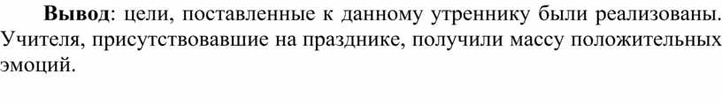 Вывод: цели, поставленные к данному утреннику были реализованы. Учителя, присутствовавшие на празднике, получили массу положительных эмоций.